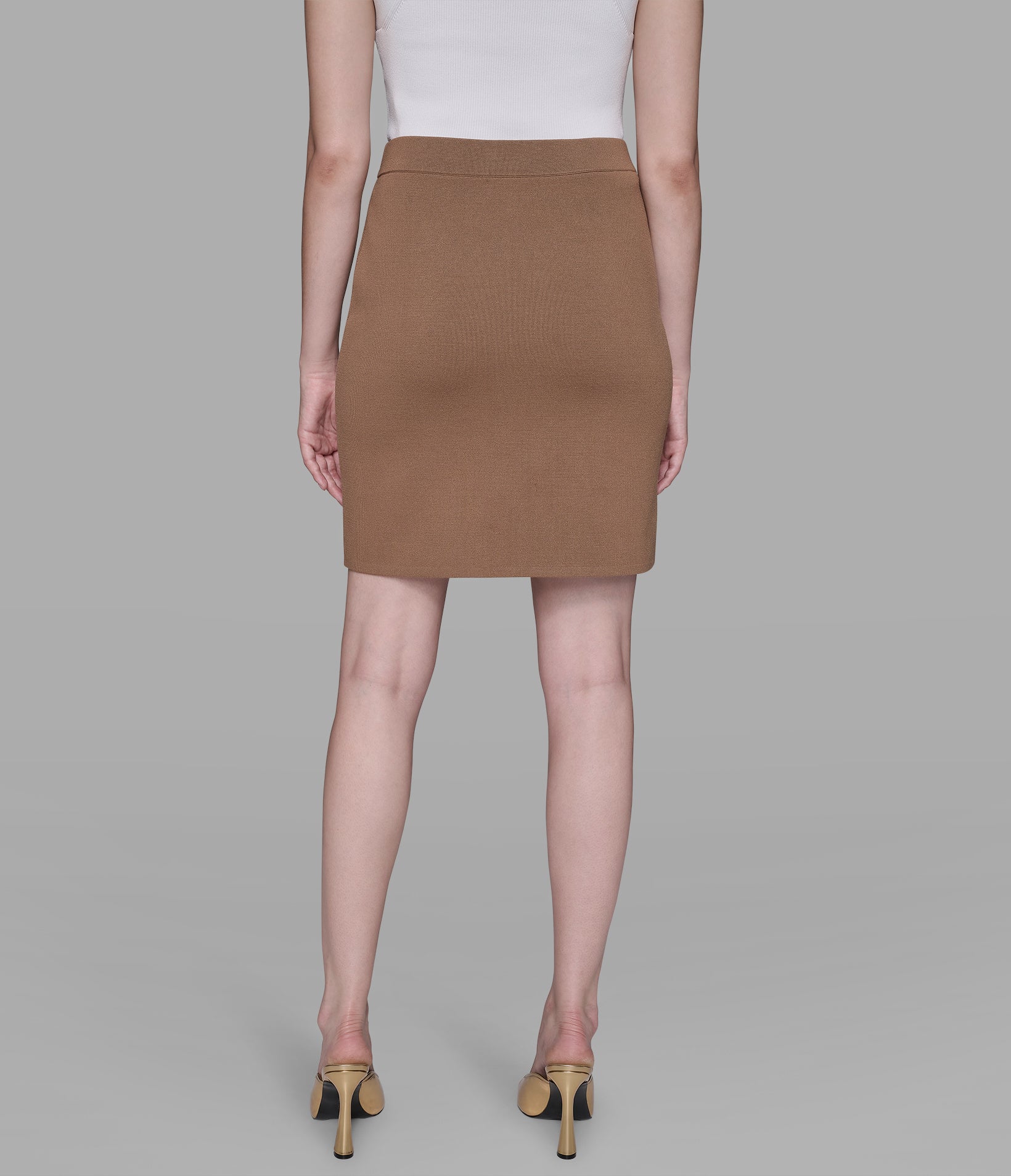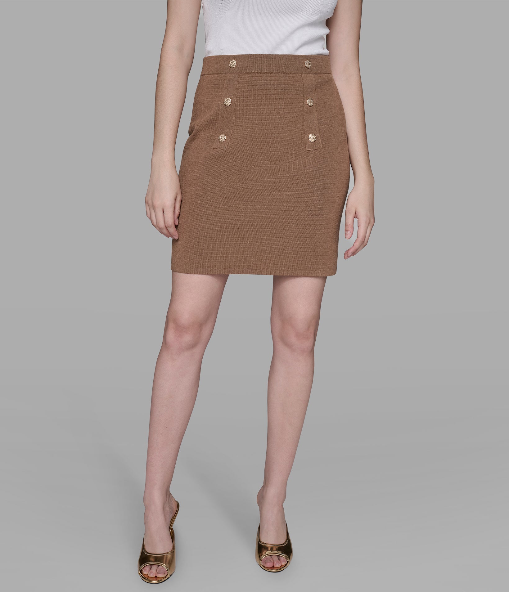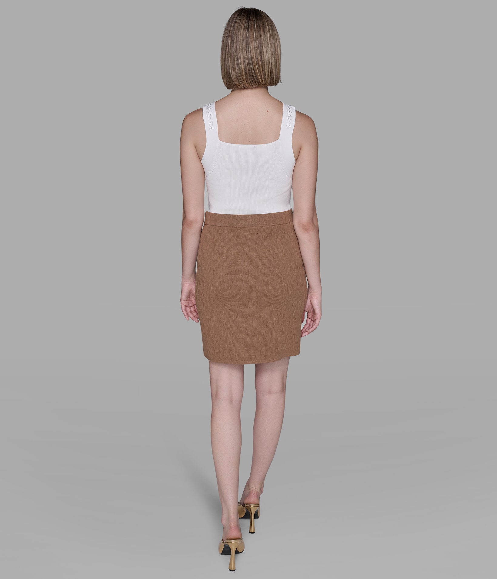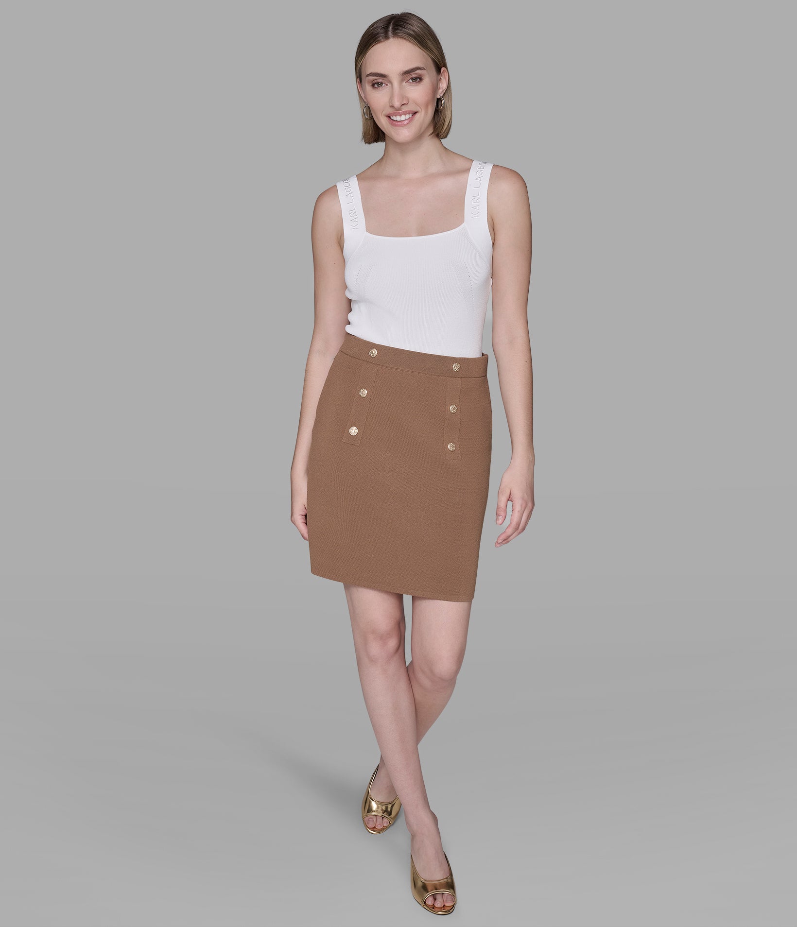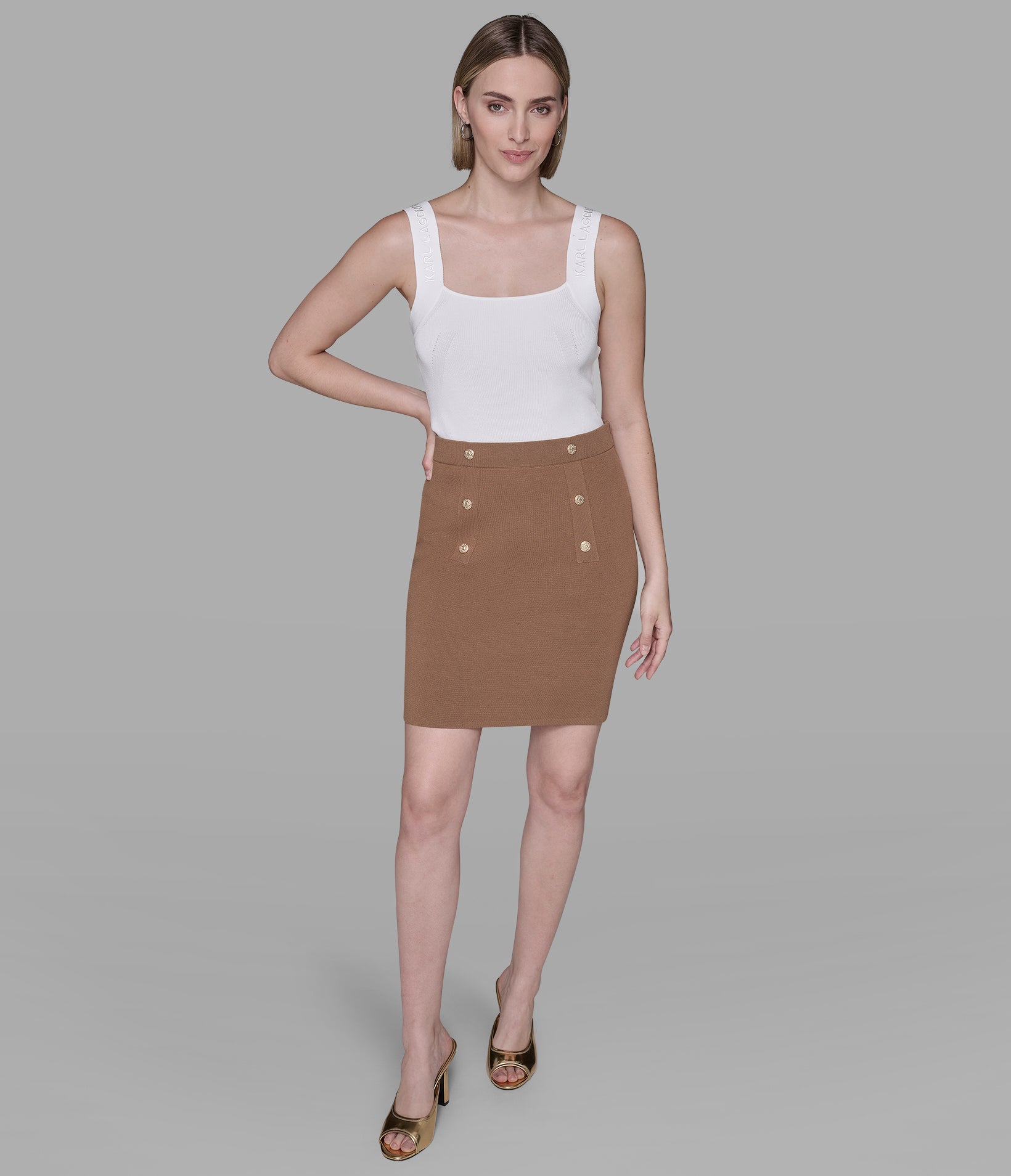 Off-duty goes high-fashion in this mini, matched with a longline cardi and soft cami, with floral low-tops to finish the look.