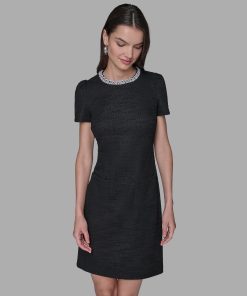 Karl Lagerfeld Women’s Knit Tweed Shift With Pearl Trim | Black