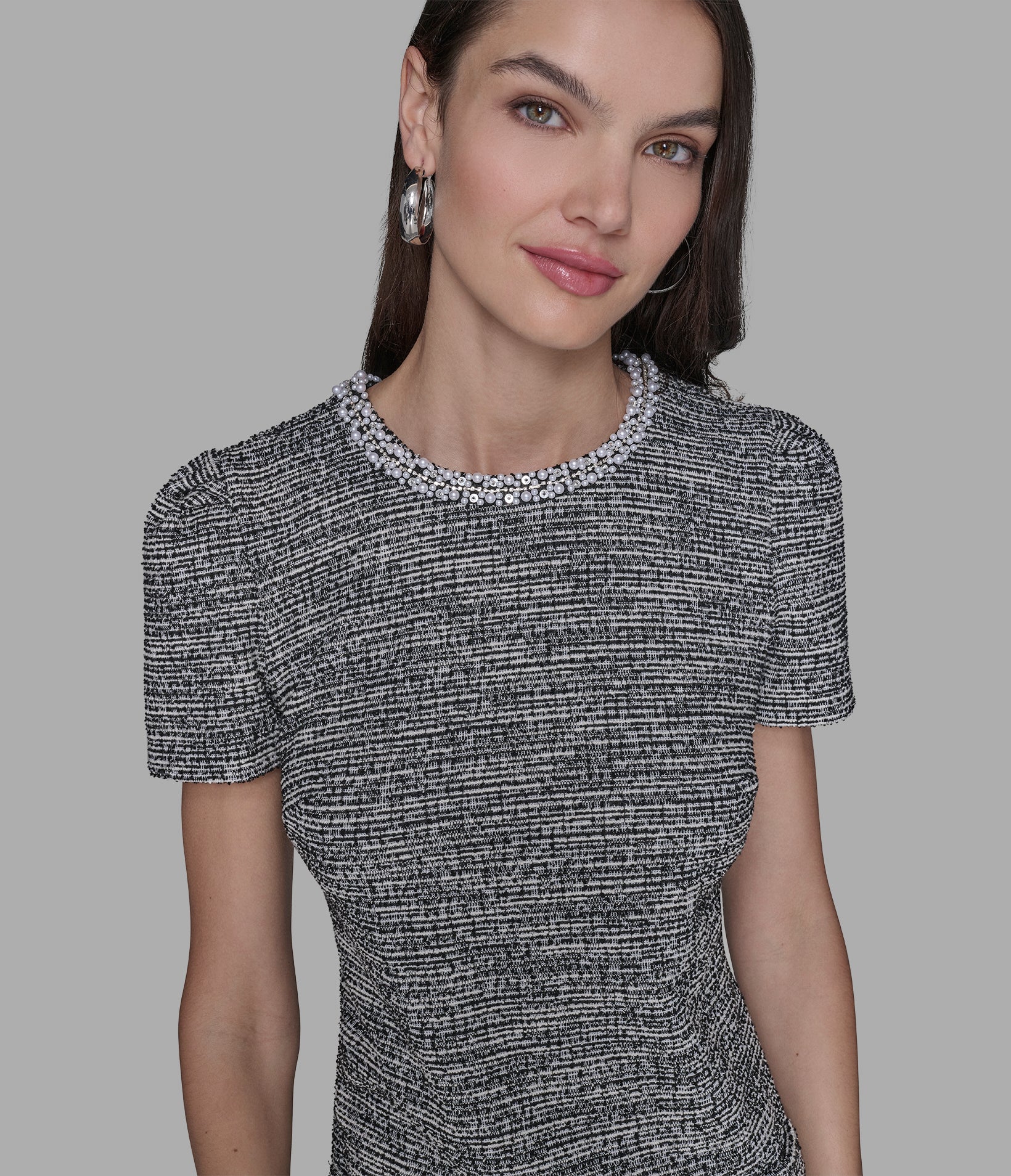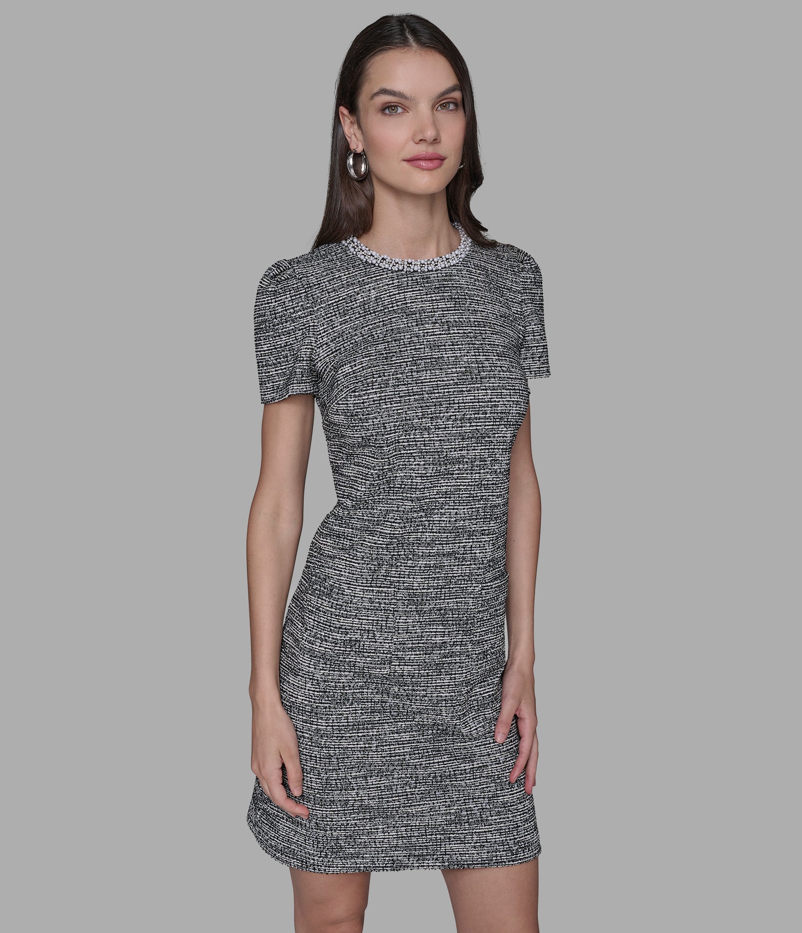 Karl Lagerfeld Women’s Knit Tweed Shift With Pearl Trim | Black