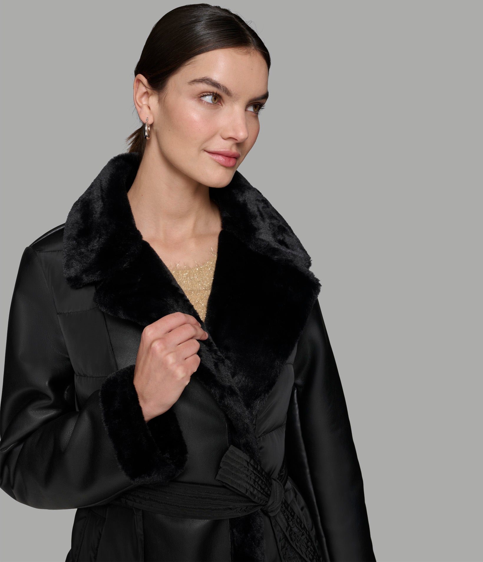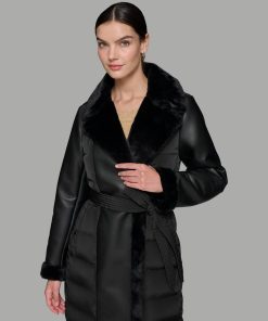 Karl Lagerfeld Women’s Mixed Media Maxi Belted Puffer With Faux Fur | Black