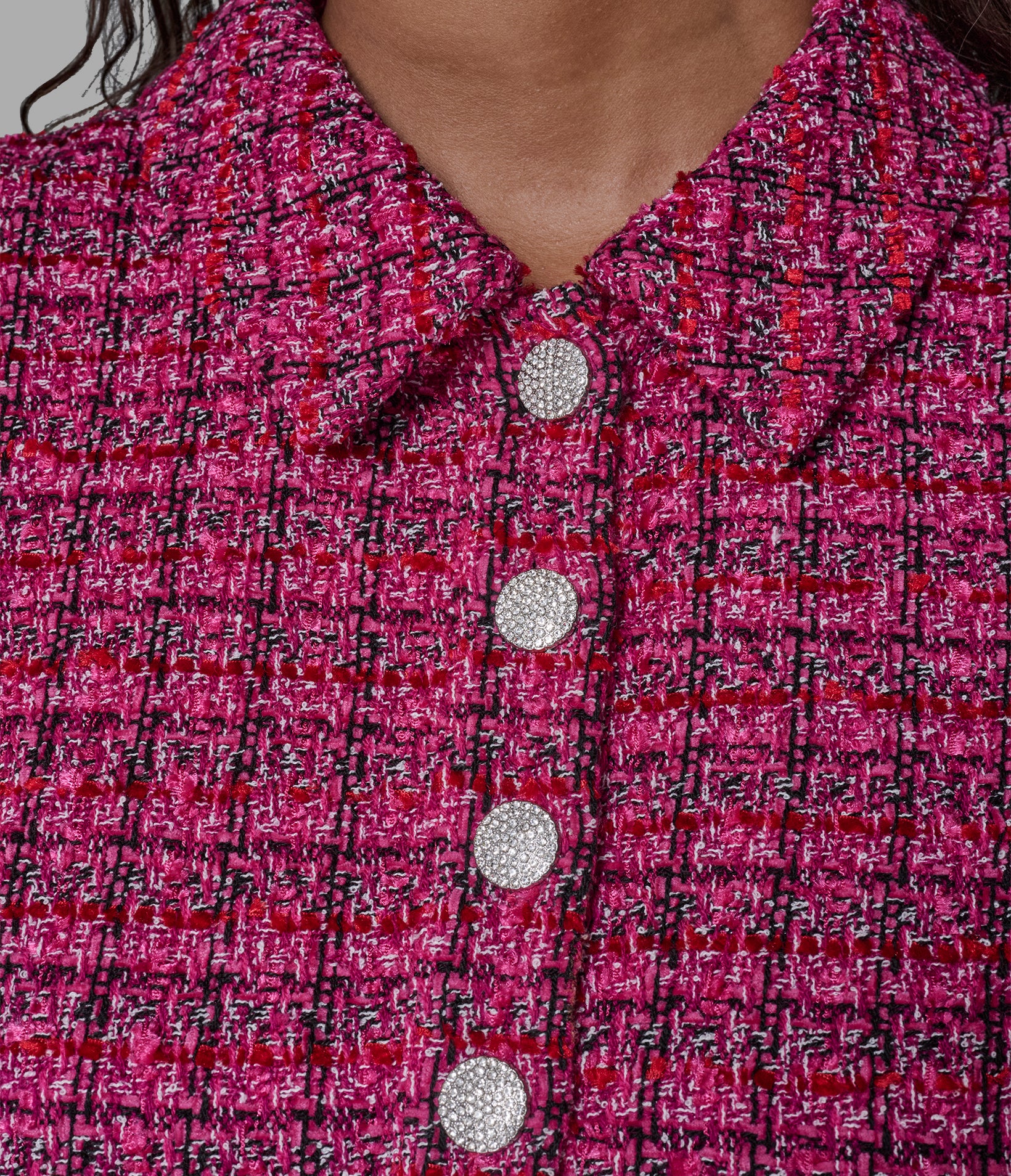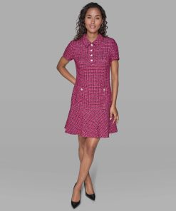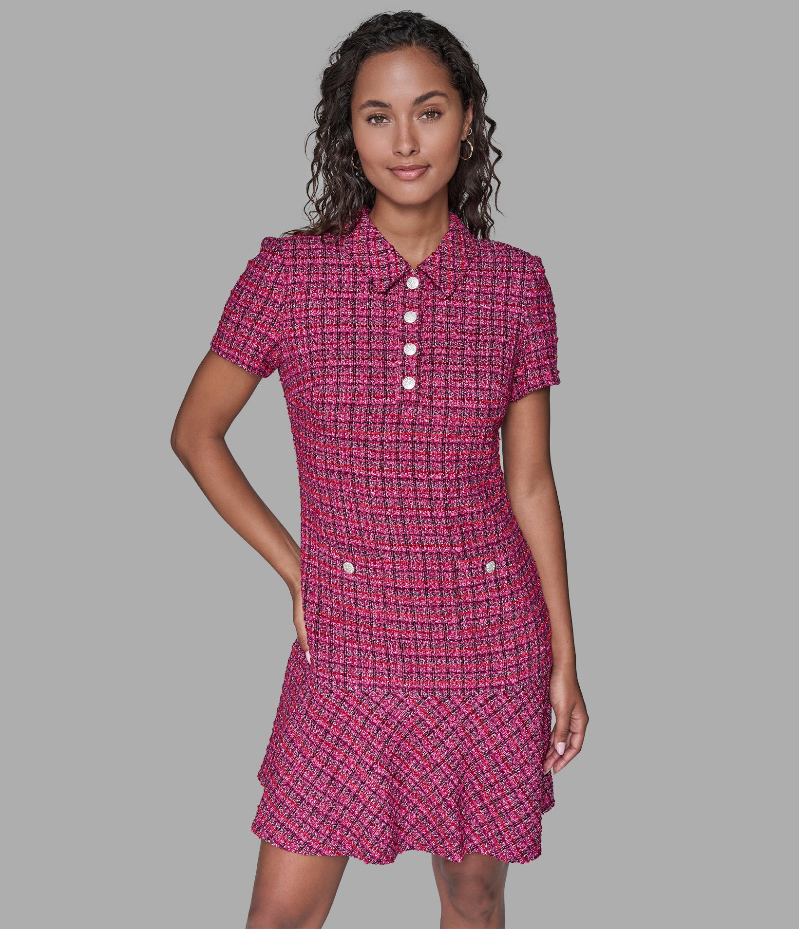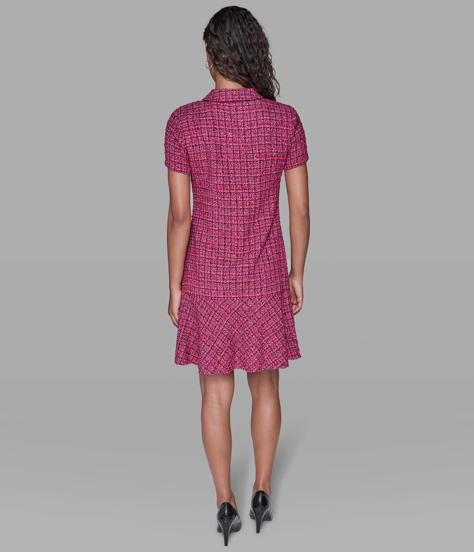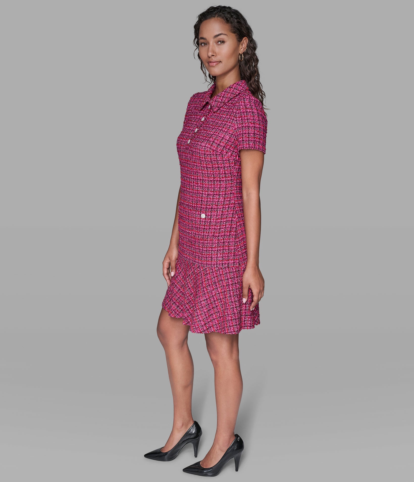 When this tweed dress shows up with herringbone slingback pumps, chic leads the conversation.