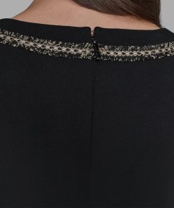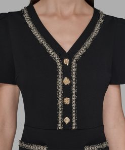 Sharp pleats, elegant tweed, and gold buttons–this dress is très Lagerfeld with a glint of glam.